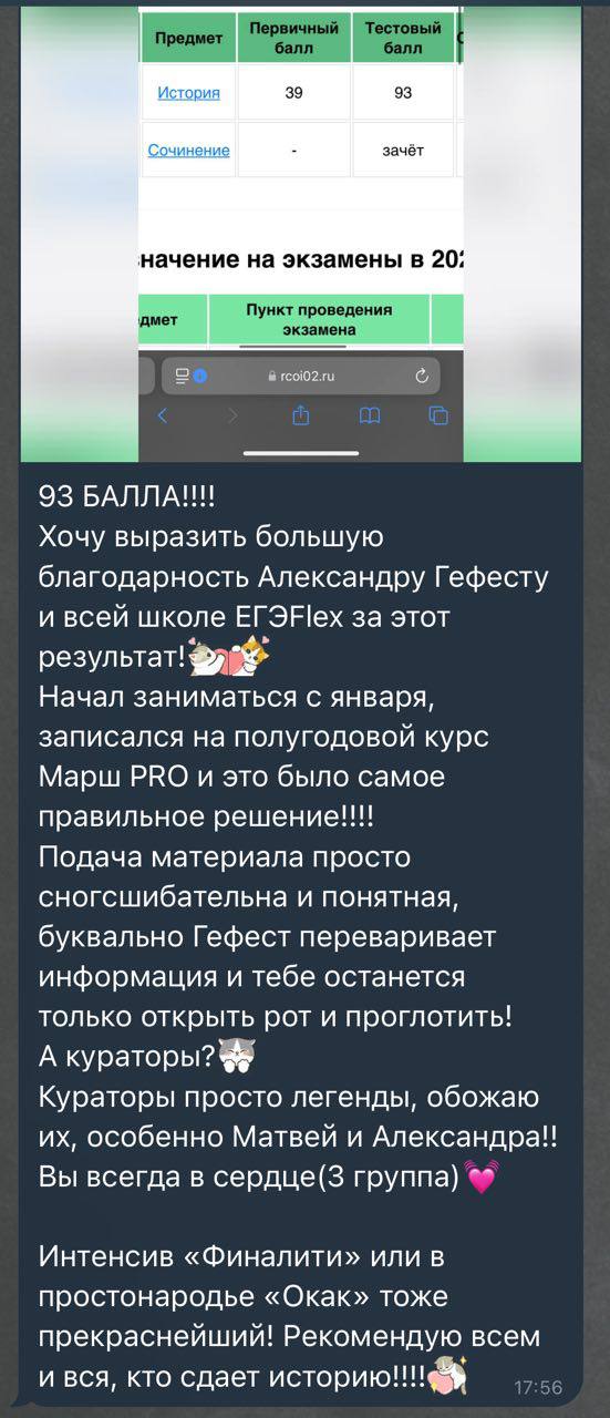 Я долго искала хорошего репетитора по истории пока в середине сентября наткнулась на запись одного из открытых вебов, с самого начала Александр привлек своим юмором и хорошей, лёгкой и понятной подачей. Начала заниматься на годовом, а вспоминая чужие открытые уроки понимаю, что преимущество Гефеста в том, что материал подан не в виде определенного количества информации, которое надо заучить наизусть, а в виде запоминающихся аналогий, шуток и просто аббревиатура (например тот же ЖиРоК). Вебы длились не сильно долго, но за один такой урок очень многое запоминалось надолго без повторения, а прорешивание заданий после прохождения события помогло мне и на самом ЕГЭ в 21 задании, тогда я почти дословно вспомнила, о чем мы говорили. Отдельное спасибо куратору Даше, которая проверяла даже сданные не в срок домашки, благодаря ее проверке получилось вывести формулировки почти до идеала. В начале года писала на хорошие баллы, но благодаря Александру сдала на 91 !! А главное то, что Курбский все ещё пёс
