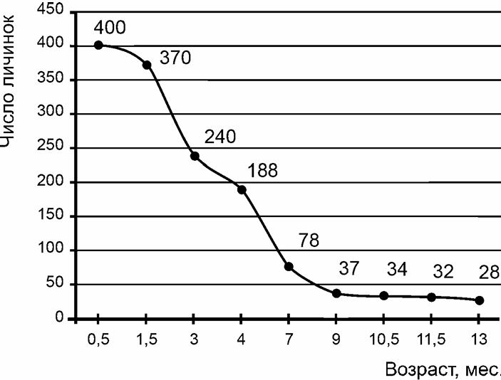 1) До возраста 18 месяцев доживают 20 личинок.