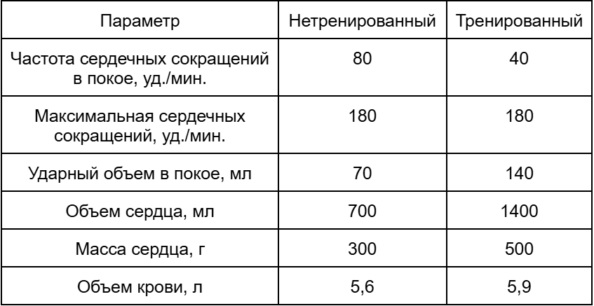 4) У тренированного человека объем сердца больше, чем у нетренированного.
