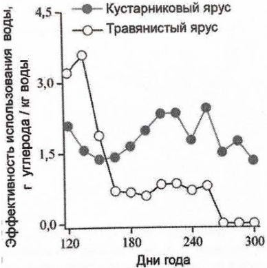 3) Эффективность использования воды во второй половине года кустарниковыми растениями выше, чем травянистыми растениями.