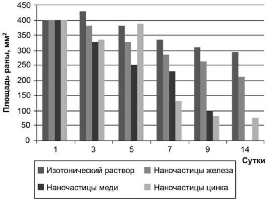 4) Максимальный ранозаживляющий эффект наночастиц цинка проявился после пятого дня терапии.