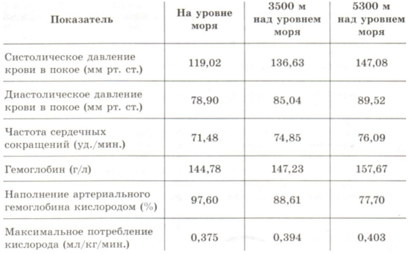 Проанализируйте таблицу "Средние физиологические показатели крови и сердечно-сосудистой системы у группы туристов, восходящих на Эверест". Выберите утверждения, которые можно сформулировать на основании анализа полученных результатов. Запишите в ответе цифры, под которыми указаны выбранные утверждения.