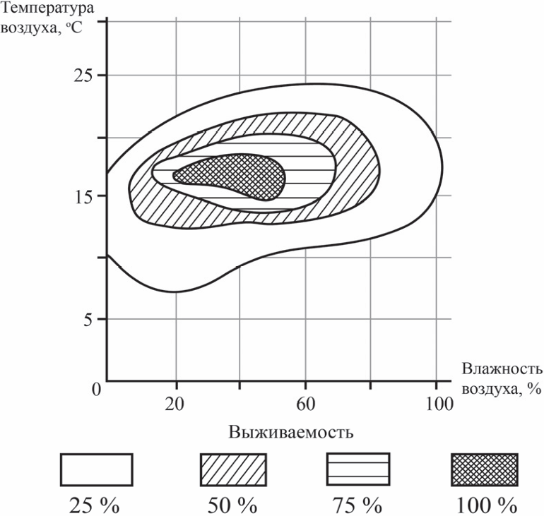 1) При температуре 10°C и влажности 30% выживаемость соснового коконопряда равна 25%.