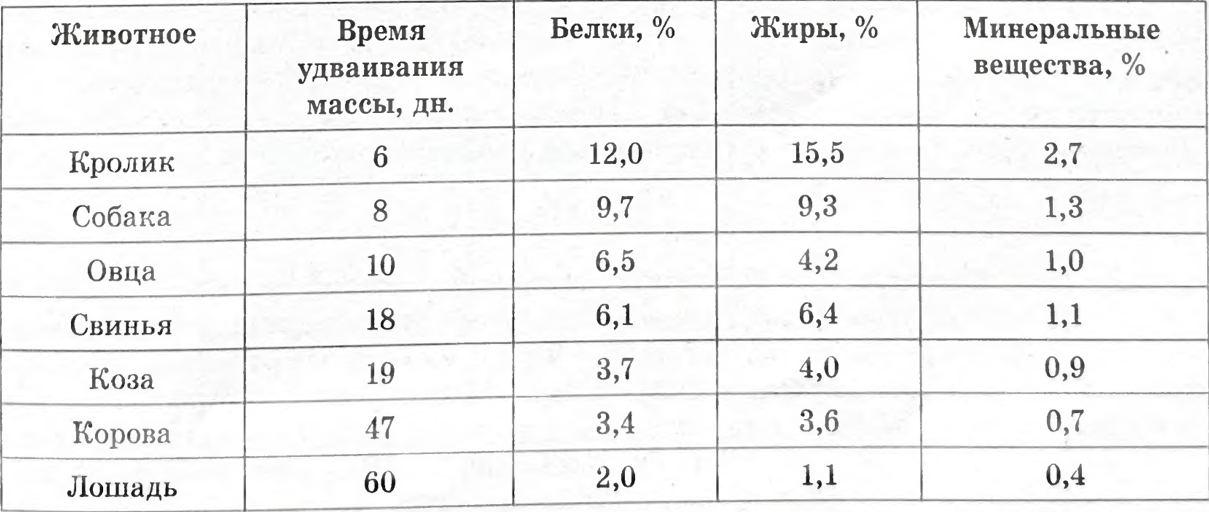 4) Наименьшую скорость роста имеют детеныши млекопитающих с наименьшей концентрацией органических и минеральных веществ в молоке.