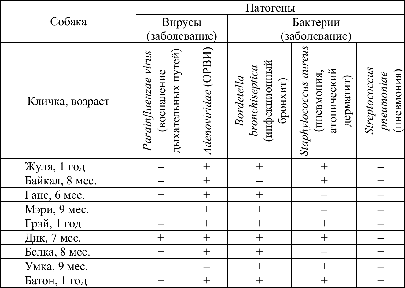 4) У всех исследуемых собак патология обусловлена заражением от трёх до пяти видов патогенов.