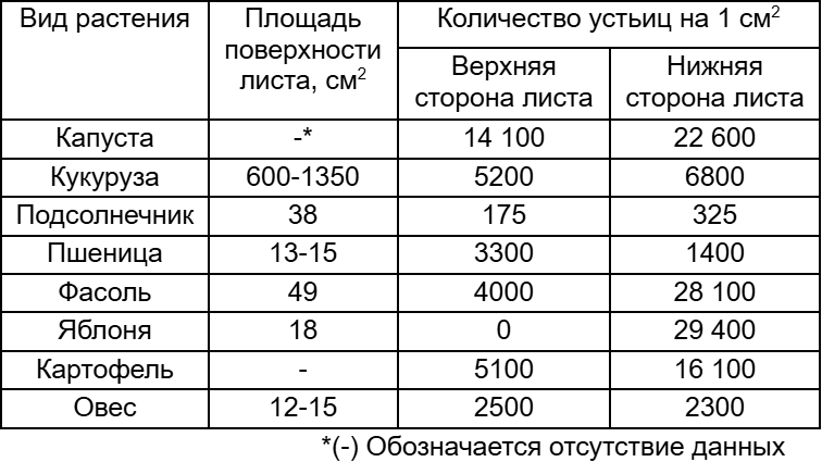 1) У капусты, фасоли и яблони количество устьиц на нижней стороне листа больше, чем на верхней.