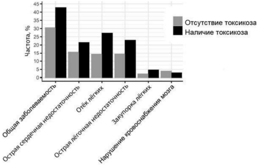 Проанализируйте график "Частота возникновения сопутствующих заболеваний у женщин на поздних сроках беременности в зависимости от наличия токсикоза". Выберите утверждения, которые можно сформулировать на основании анализа представленных данных. Запишите в ответе цифры, под которыми указаны выбранные утверждения.