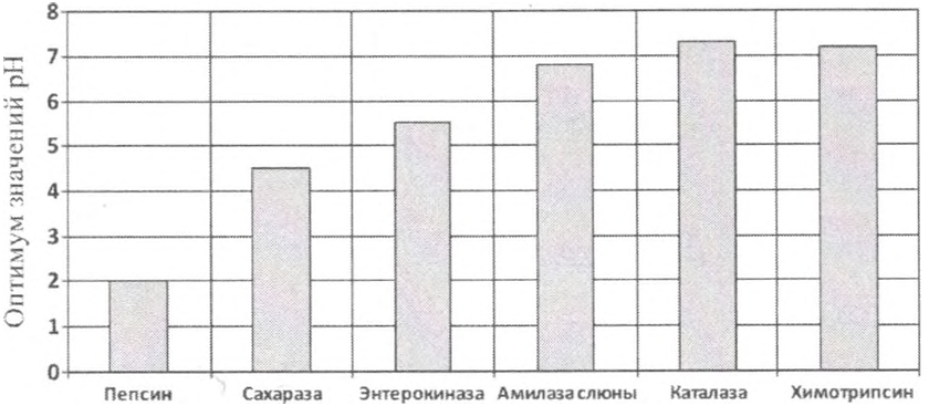 2) На диаграмме представлены ферменты, оптимум которых лежит в области нейтральных значений pH (6.8-7.2) и ниже.