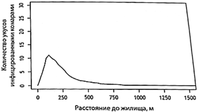 2) На расстоянии от 130 м до жилища вероятность укуса снижается.