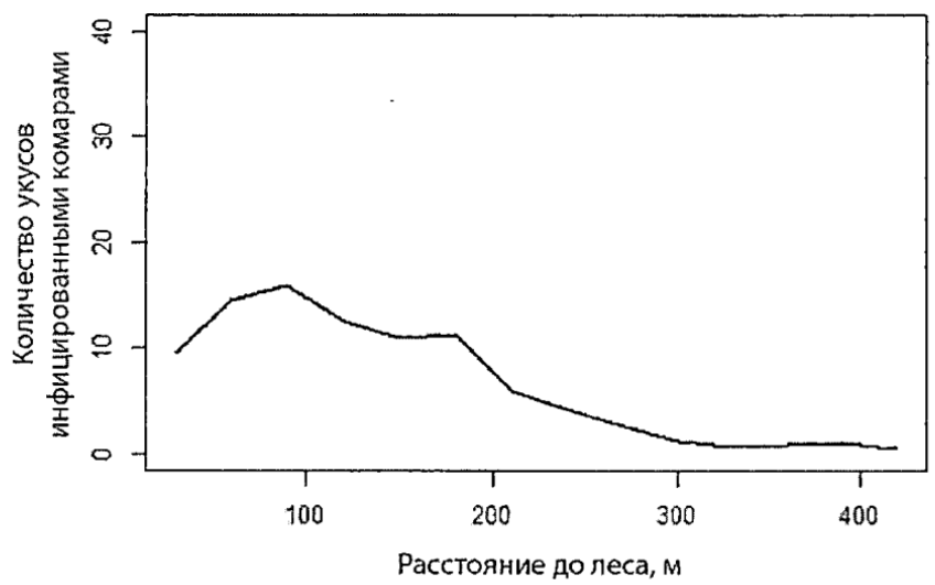 3) Доля инфицированных малярией комаров уменьшается по мере удаления от леса.