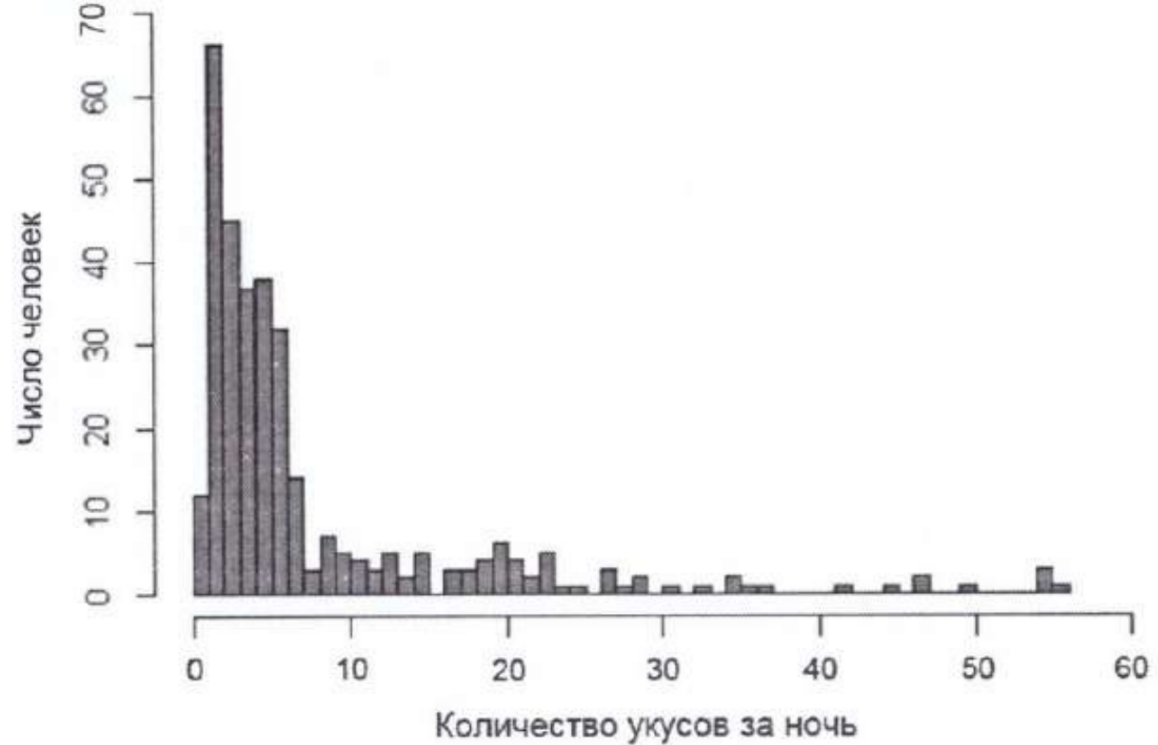 Проанализируйте диаграмму «Количество укусов за ночь людей малярийными комарами на острове Борнео». На графике отложено число человек, которые были укушены за ночь определённое количество раз. Выберите утверждения, которые можно сформулировать на основании анализа представленных данных. Запишите в ответе цифры, под которыми указаны выбранные утверждения.