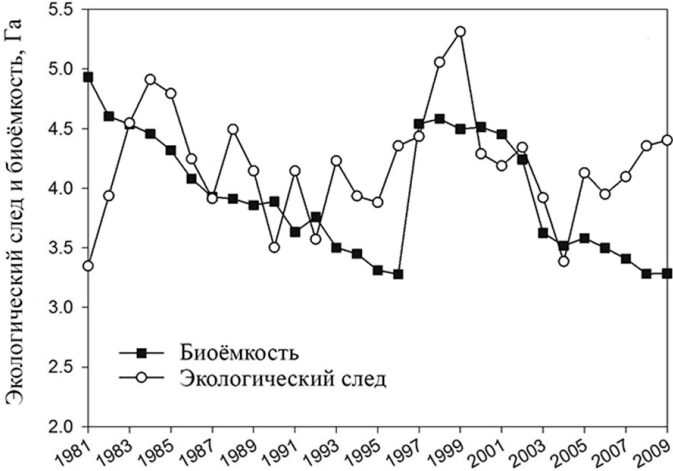 Проанализируйте графики «Изменение экологического следа и биоёмкости сельскохозяйственных угодий одной из провинций Китая». Экологический след – условная величина, характеризующая размер площади, необходимой для обеспечения одного человека пищей, теплом и т. д. в течение года. Биоёмкость – условная величина, характеризующая площадь биологически продуктивной территории, которая может использоваться для удовлетворения потребностей человека в течение года. Выберите утверждения, сформулированные на основании анализа полученных результатов. Запишите в ответе цифры, под которыми указаны выбранные утверждения.