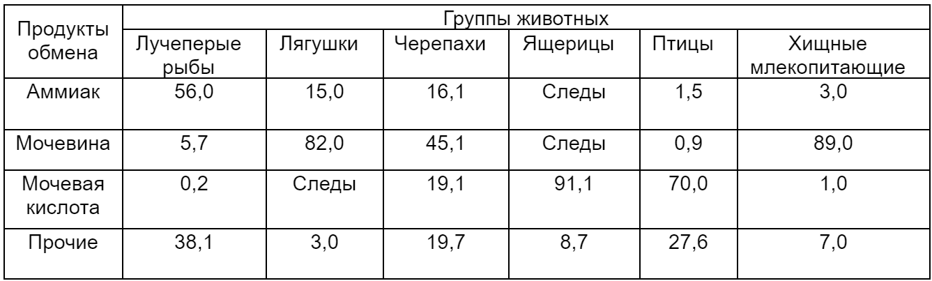3) В результате обменных процессов у животных разных групп образуются только аммиак, мочевина и мочевая кислота.