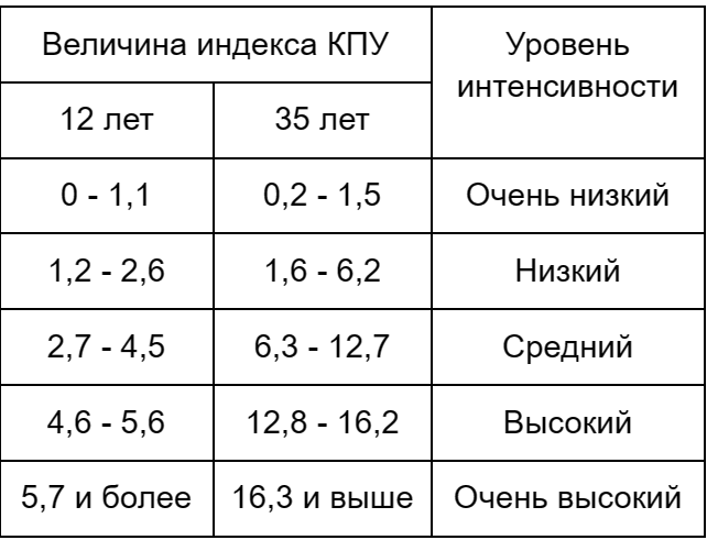 4) Чем выше величина индекса КПУ, тем выше уровень интенсивности поражения зубов кариесом.