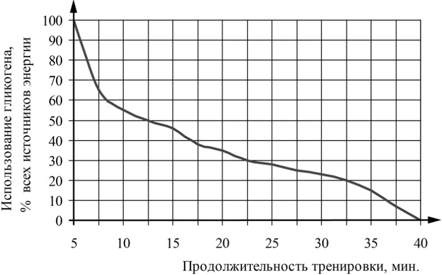 2) В организме весь гликоген полностью расщепляется за 40 минут тренировки.