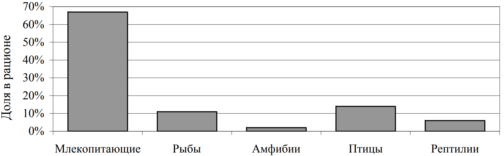 Проанализируйте гистограмму, в которой представлены позвоночные животные, составляющие пищевой рацион обитающего в тундре животного Z. Запишите в ответе цифры, под которыми указаны выбранные утверждения. Выберите все утверждения, которые можно сформулировать на основании анализа представленных данных. Животное Z можно отнести к