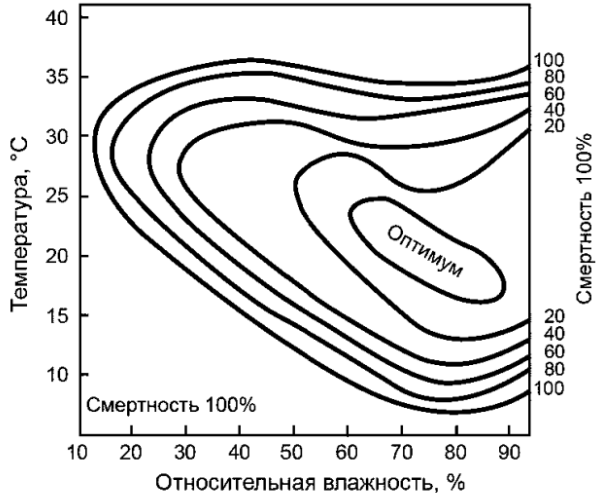3) При понижении температуры и влажности смертность куколок повышается.