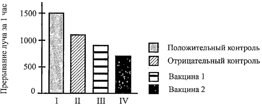 Проанализируйте диаграмму «Влияние экспериментальных вакцин на двигательную активность мышей». В клетку с мышами был установлен фотоэлемент, фиксирующий количество прерываний луча (прохождений мышей перед фотоэлементом). I группу мышей использовали в качестве положительного контроля: им вводили белок, вызывающий иммунную реакцию. II группу мышей использовали в качестве отрицательного контроля: им вводили физраствор. Ill группе мышей вводили вакцину 1.