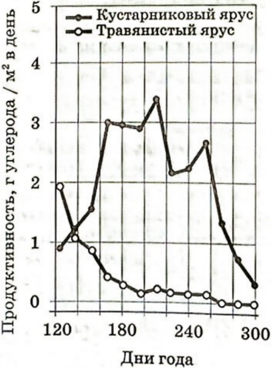 Проанализируйте график изменения продуктивности травянистого и кустарникового ярусов экосистемы в течение года. Выберите все утверждения, которые можно сформулировать на основании анализа представленных данных. Запишите в ответе цифры, под которыми указаны выбранные утверждения.
