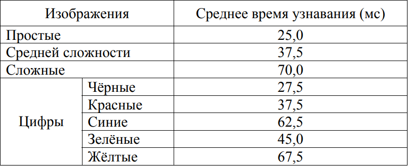 Проанализируйте таблицу «Время, необходимое для узнавания тест-изображения». Испытуемым демонстрировались цифры разных цветов и чёрно-белые изображения разной сложности. Фиксировалось время, необходимое испытуемому, чтобы распознать и назвать объект. Выберите утверждения, которые можно сформулировать на основании анализа представленных данных. Запишите в ответе цифры, под которыми указаны выбранные утверждения.