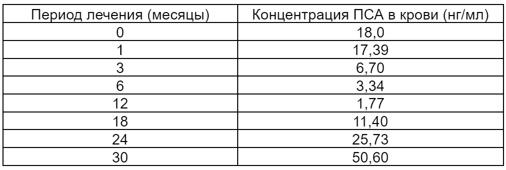 1) К третьему месяцу лечения концентрация ПСА в крови больного N снизилась примерно в 2,5 раза.