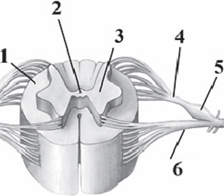 Выберите три верно обозначенные подписи к рисунку, на котором изображено строение спинного мозга человека. Запишите в таблицу цифры под которыми они указаны.
