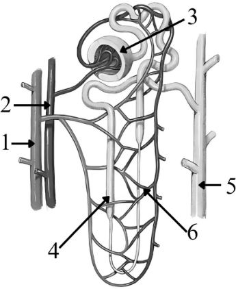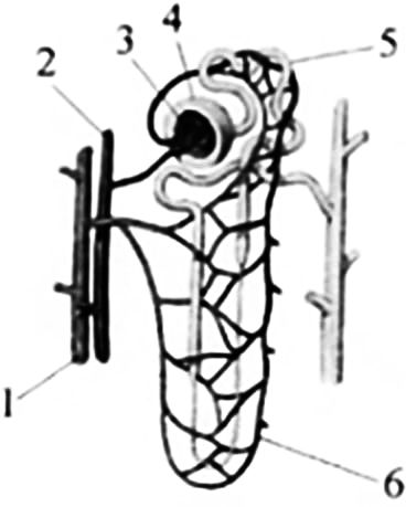 Выберите три верно отмеченные подписи к рисунку, на котором изображено строение нефрона человека. Запишите цифры, под которыми они указаны.