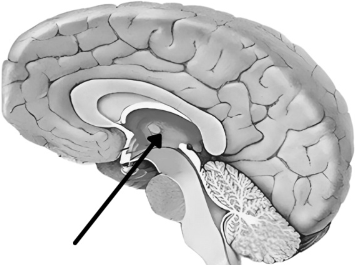 Выберите три верных ответа из шести и запишите цифры, под которыми они указаны. Какие рефлекторные центры расположены в отделе головного мозга человека, обозначенном на рисунке стрелкой?