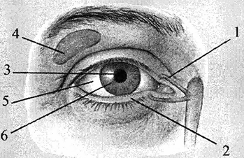 Выберите три верно обозначенные подписи к рисунку, на котором изображён глаз человека. Запишите цифры, под которыми они указаны.