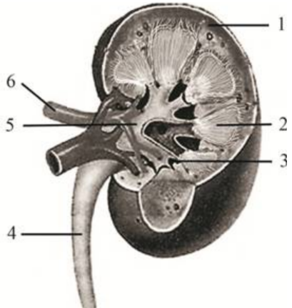 Выберите три верно обозначенные подписи к рисунку "Строение почки человека". Запишите цифры, под которыми они указаны.