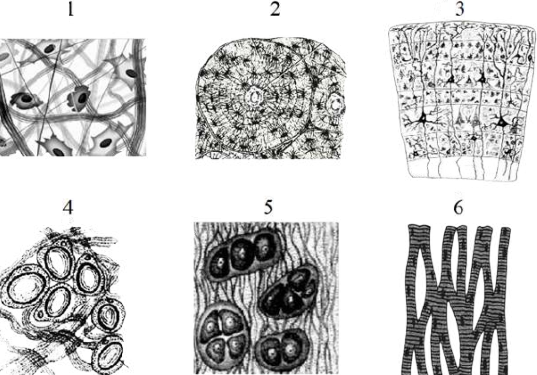 Выберите три верно обозначенные подписи к рисунку, на котором изображены ткани человека. Запишите цифры, под которыми они указаны.