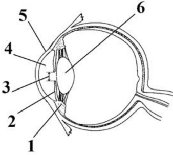 Выберите три верно обозначенные подписи к рисунку, на котором изображено строение глаза человека. Запишите цифры, под которыми они указаны.