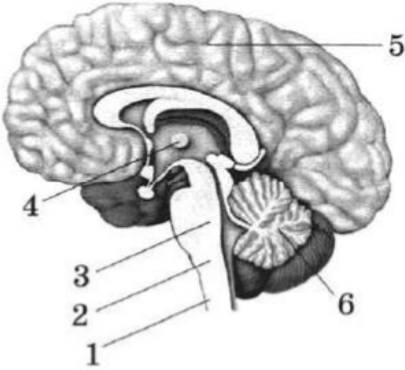 Выберите три верно обозначенные подписи к рисунку "Отделы головного мозга". Запишите цифры, под которыми они указаны.