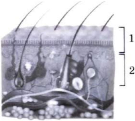 Выберите три верных ответа из шести и запишите цифры, под которыми они указаны. Характеристиками слоя кожи человека, обозначенного на рисунке цифрой 2, являются следующие: