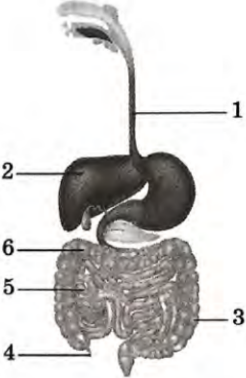 Выберите три верно обозначенные подписи к рисунку, на котором изображена пищеварительная система человека. Запишите цифры, под которыми они указаны.