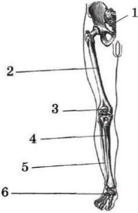 Выберите три верно обозначенные подписи к рисунку, на котором изображено строение нижней конечности человека. Запишите цифры, под которыми они указаны.