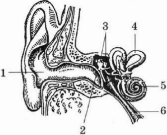Выберите три верно обозначенные подписи к рисунку "Строение уха". Запишите цифры, под которыми они указаны.