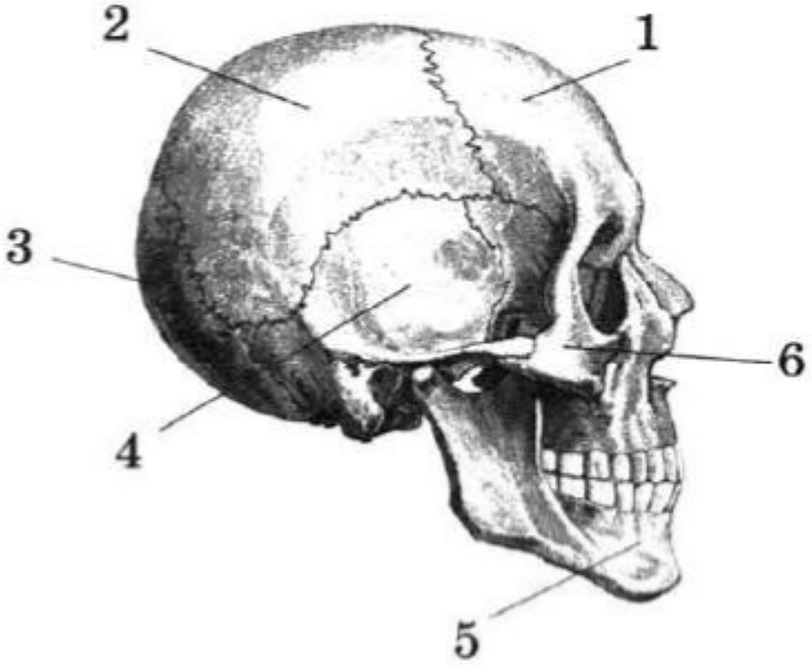 Выберите три верно обозначенные подписи к рисунку, на котором изображён череп человека. Запишите цифры, под которыми они указаны.