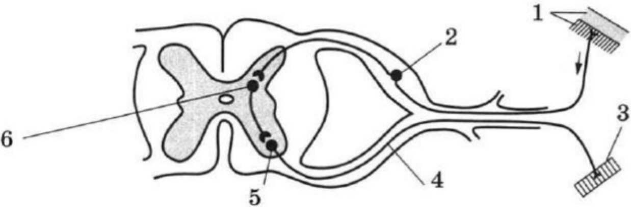 Выберите три верно обозначенные подписи к рисунку, на котором изображено строение рефлекторной дуги. Запишите цифры, под которыми они указаны.