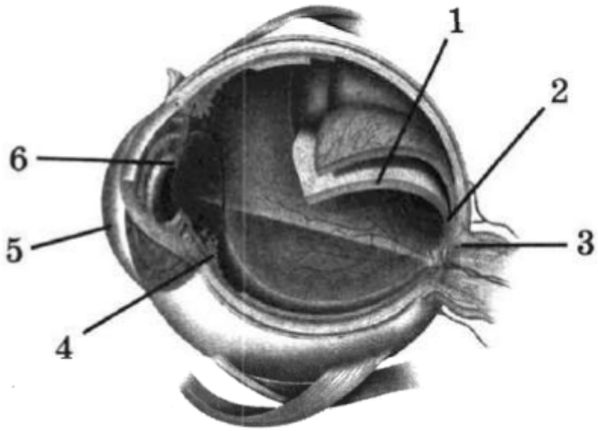 Выберите три верно обозначенные подписи к рисунку, на котором изображено строение глаза человека. Запишите цифры, под которыми они указаны.
