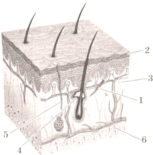 Выберите три верно обозначенные подписи к рисунку, на котором представлена схема строения кожи. Запишите цифры, под которыми они указаны.