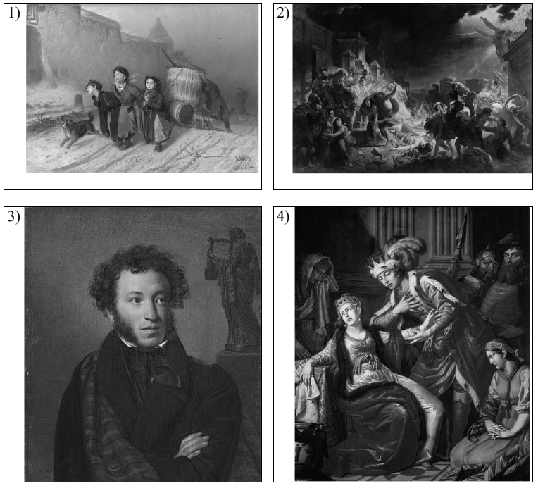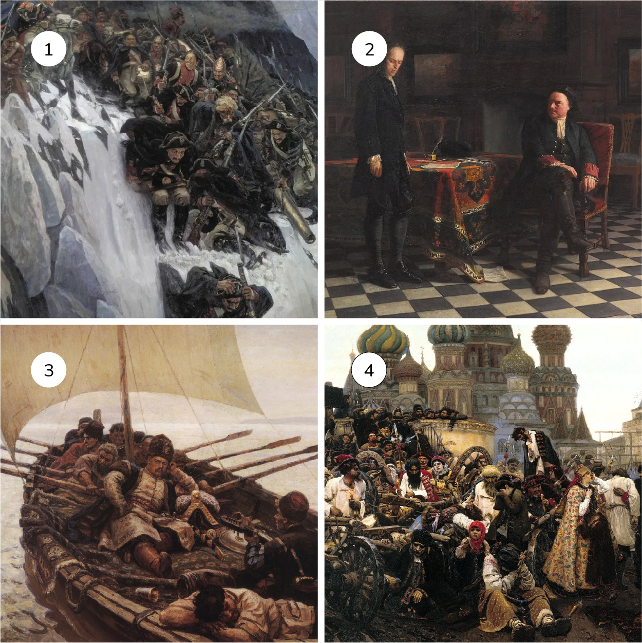Какая из представленных выше картин иллюстрирует события, произошедшие в том же десятилетии, что и основание города, юбилею которого посвящена марка? Укажите цифру, которой обозначена картина. Назовите фамилию художника, нарисовавшего её.
