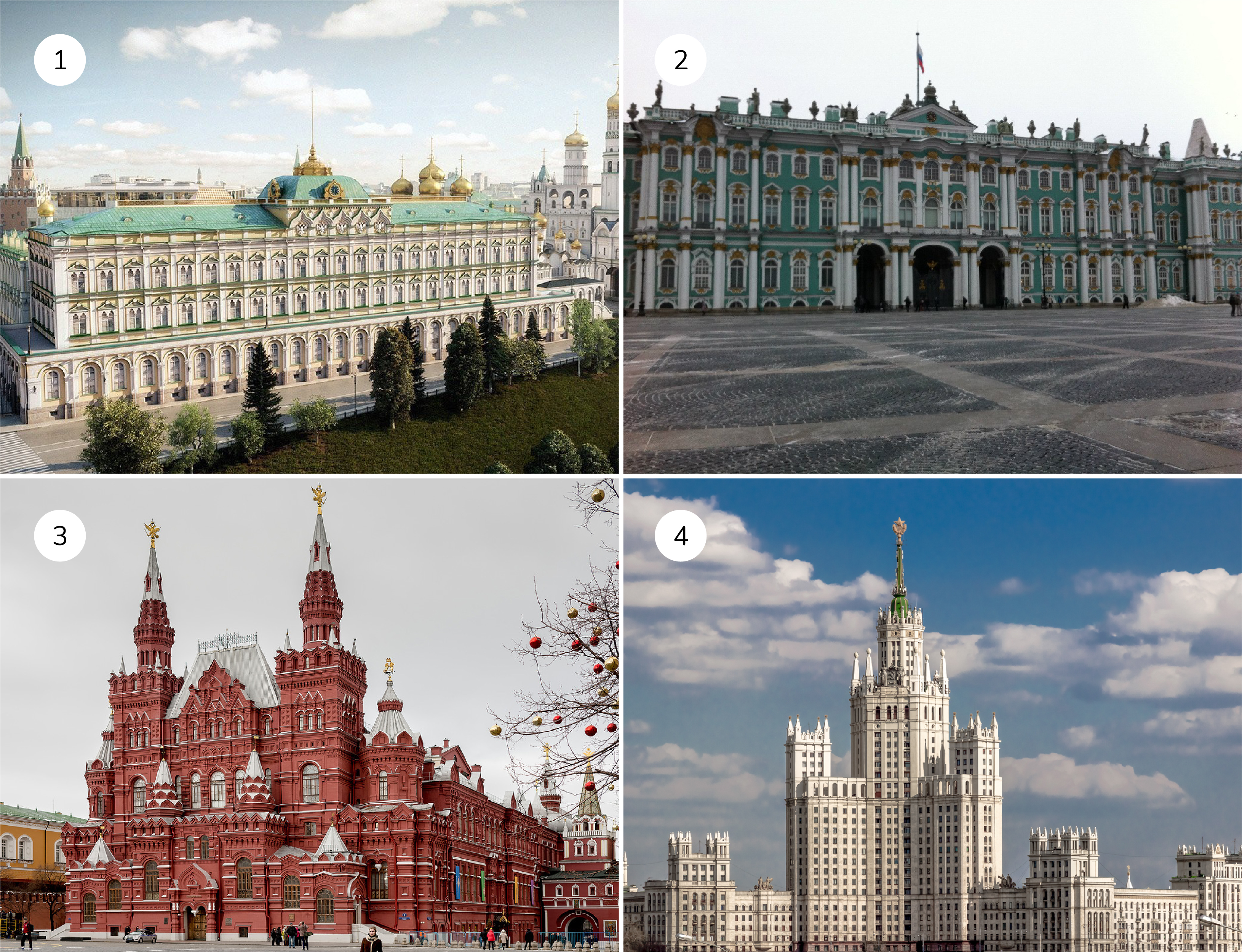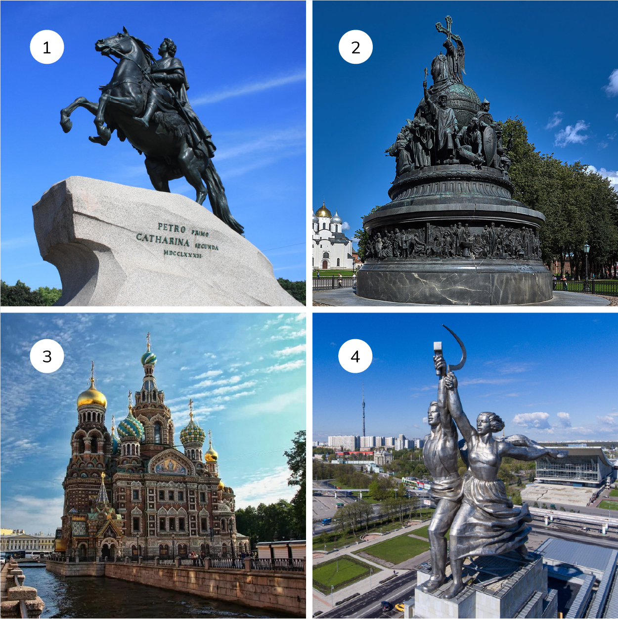 Какой из представленных ниже памятников архитектуры был создан в том же веке, когда произошло событие, которому посвящена данная медаль? В ответе запишите цифру, которой обозначен этот памятник архитектуры. Укажите название города, где находится этот памятник архитектуры.