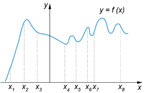 На рисунке изображен график функции и восемь точек на оси абсцисс: x1, x2, x3, ..., x8. В скольких из этих точек производная функции