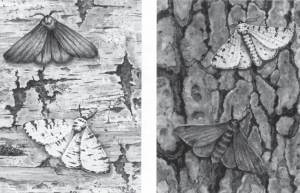 Рассмотрите рисунки с изображением бабочек берёзовых пядениц. Заполните пустые ячейки таблицы, используя элементы, приведённые в списке. Для каждой ячейки, обозначенной буквой, выберите соответствующий элемент из предложенного списка.