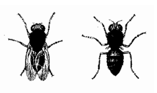 Рассмотрите рисунки с изображением плодовых мушек дрозофил (Drosophila melanogaster), участвовавших в эксперименте, по результатам которого был сформулирован закон. Заполните пустые ячейки таблицы, используя элементы, приведённые в списке. Для каждой ячейки, обозначенной буквой, выберите из предложенного списка.