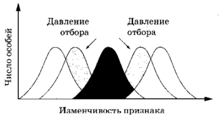Стабилизирующий | Давлению подвергаются особи с проявлением признака, отклоняющимся от среднего значения |