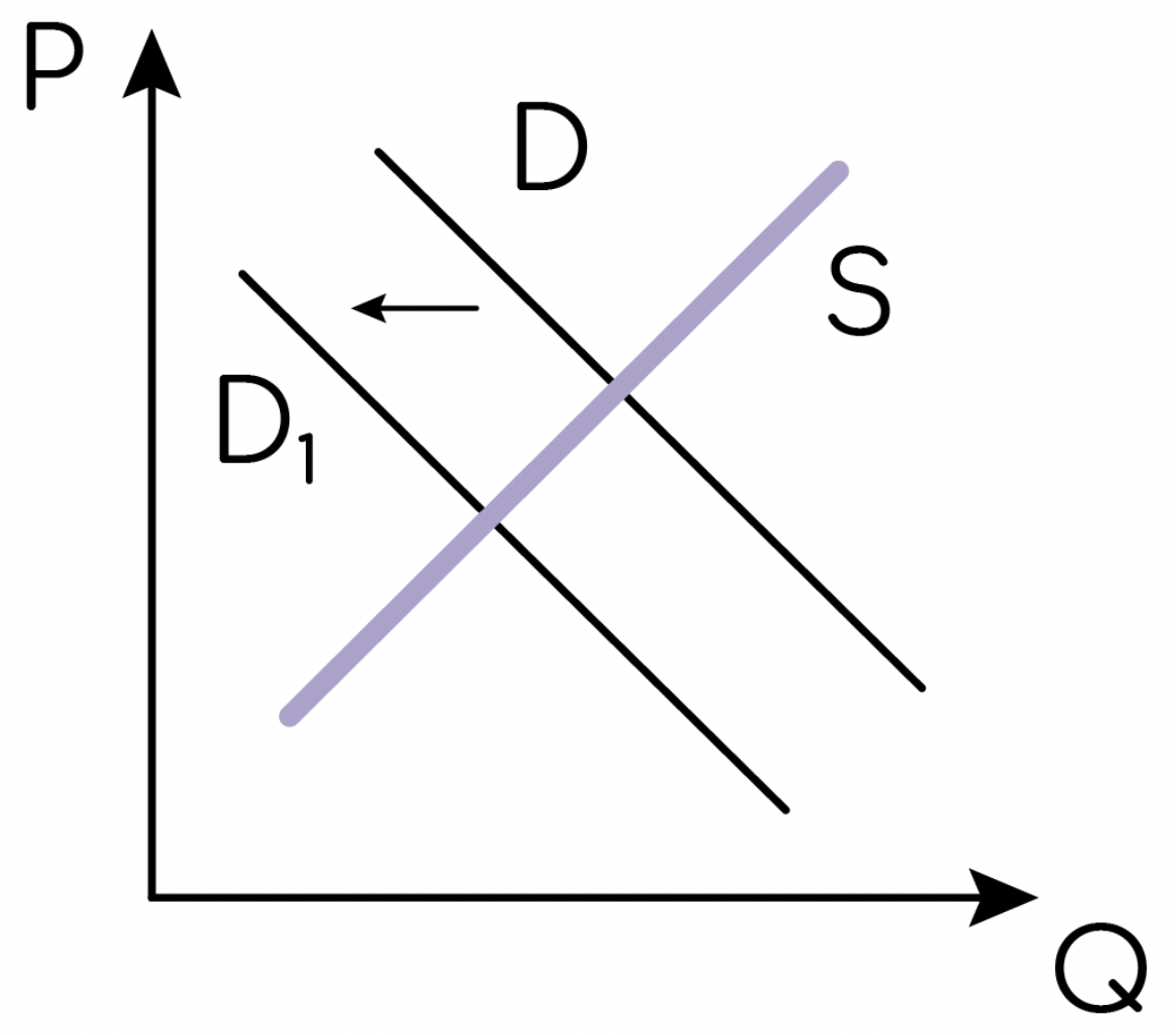 На графике изображено изменение ситуации на потребительском рынке лекарств отечественного производства в стране Z. Кривая спроса переместилась из положения D в положение D1 при неизменном предложении S. (На графике P — цена товара; Q — количество товара).