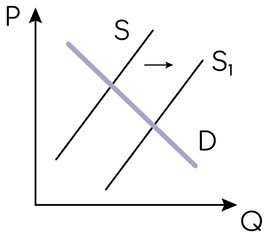 На графике изображено изменение ситуации на потребительском рынке нефти и нефтепродуктов. Кривая предложения переместилась из положения S в положение S1 при неизменном спросе D. (На графике P — цена товара; Q — количество товара).