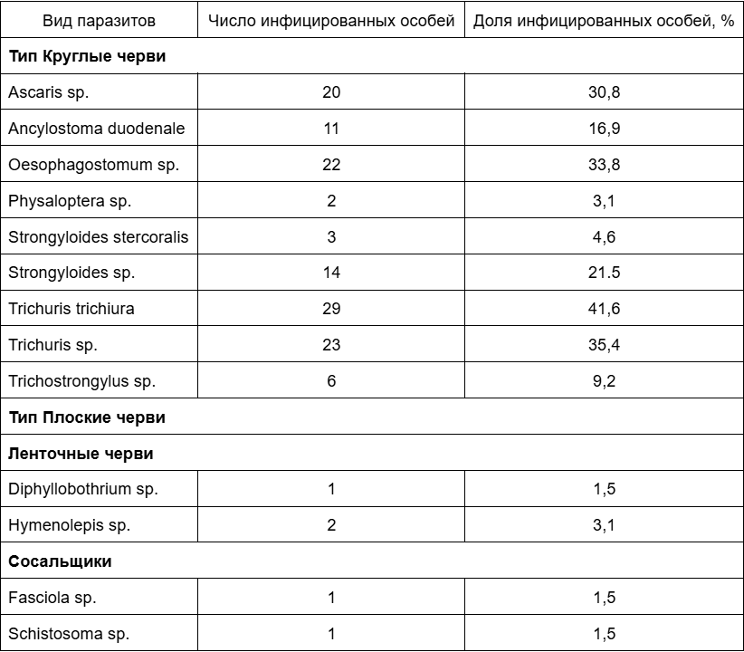 1) В исследованной популяции обезьян среди паразитических червей наиболее представлены вида типа Круглые черви.